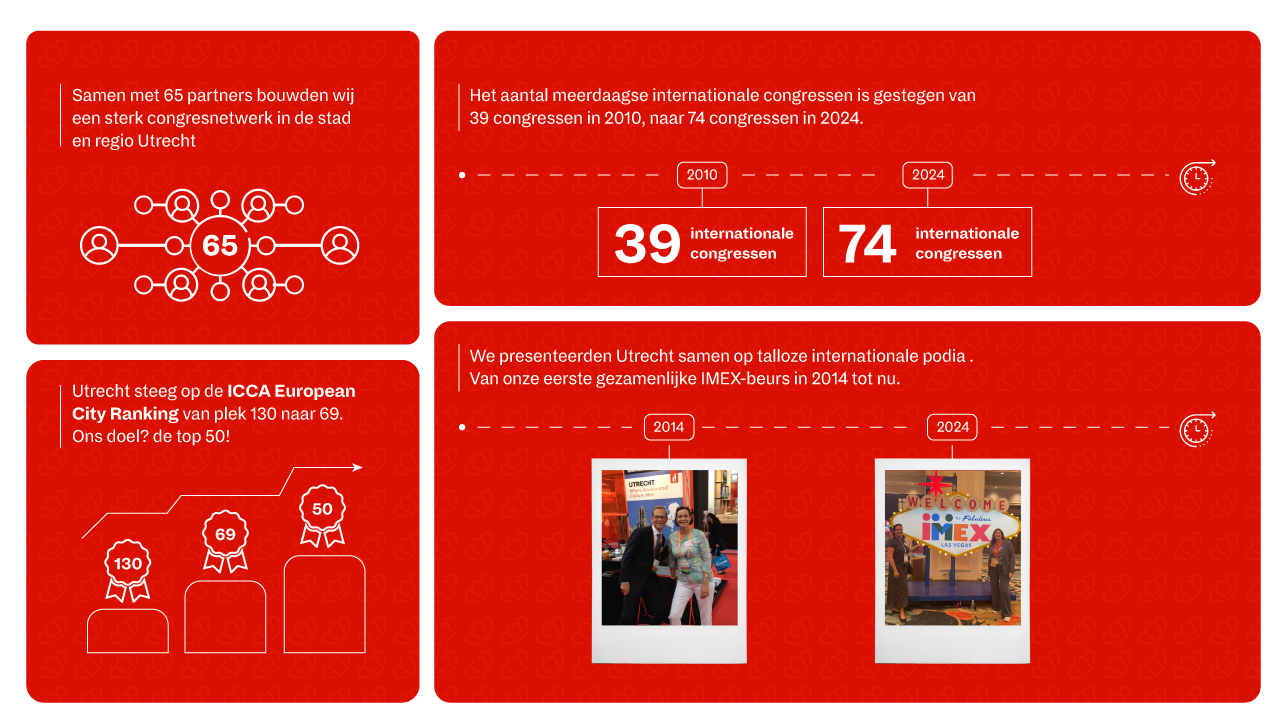 En dat zorgt voor mooie resultaten waar we ontzettend trots op zijn. Want waar veel internationale organisatoren aanvankelijk Amsterdam of Rotterdam in gedachten hebben, blijkt Utrecht toch ook enorm charmant. Monique: “Als internationale organisatoren Utrecht bezoeken, zijn ze vaak verrast. Zodra ze langs de grachten wandelen of bij Jaarbeurs binnenstappen, zijn ze verkocht.”